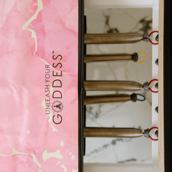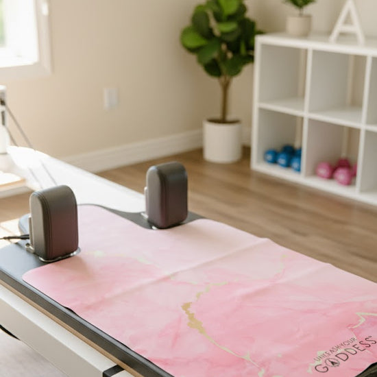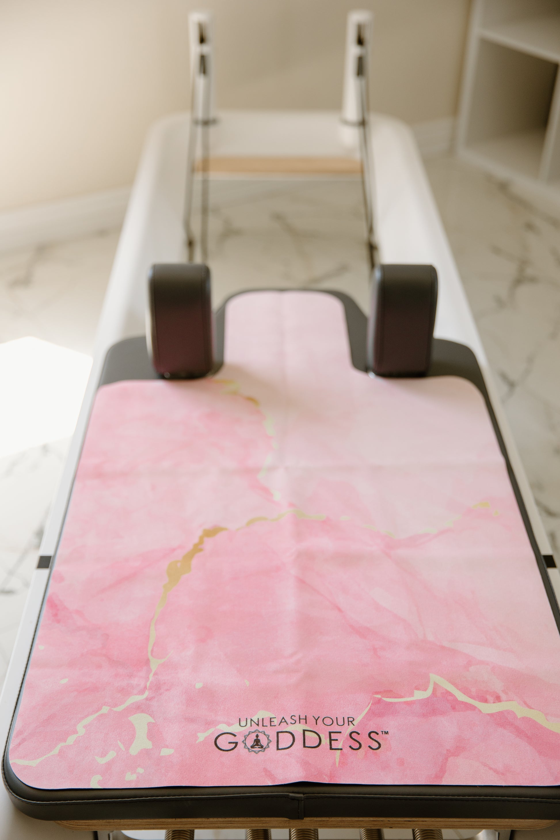 Experience the elegance of our Glow Aura Reformer Mat. This limited-edition luxury mat is designed to bring a touch of sophistication to your workout space. With its pink and gold hues, it exudes a radiant goddess energy that will inspire your fitness journey. Made with high-quality materials, it provides a comfortable and durable surface for your workouts. Elevate your fitness experience with this stunning mat.