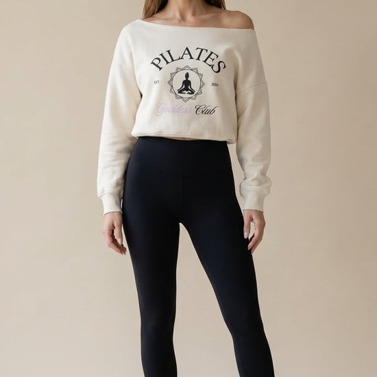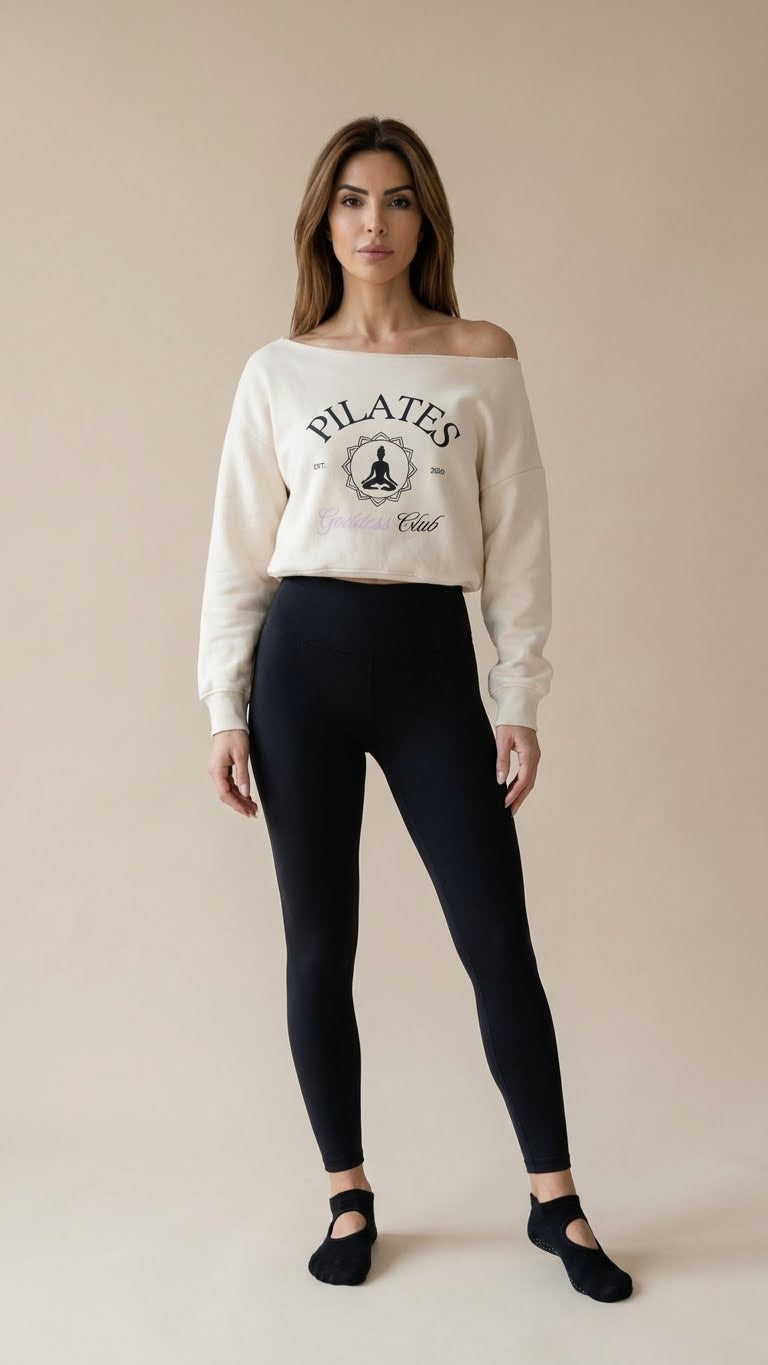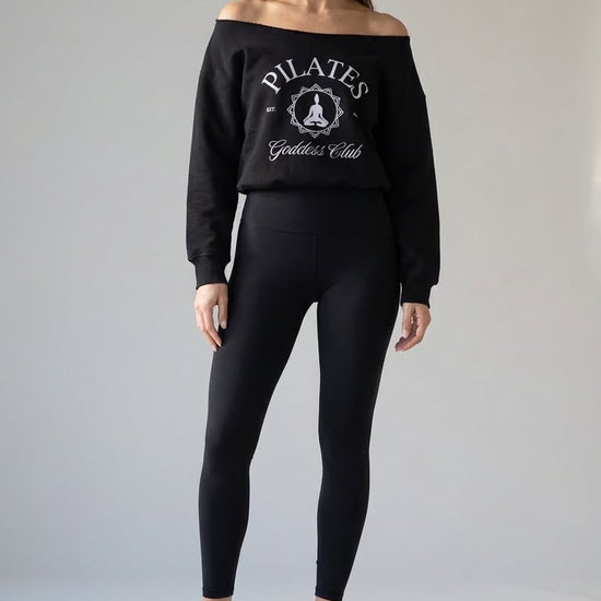 Available in Black, Bone, and Espresso, each shade brings its own mood; timeless, soft, or earthy. The front features our exclusive Pilates Goddess Club est. 2020 design, printed with intention to honor the movement, community, and confidence that inspires us.