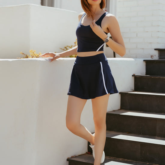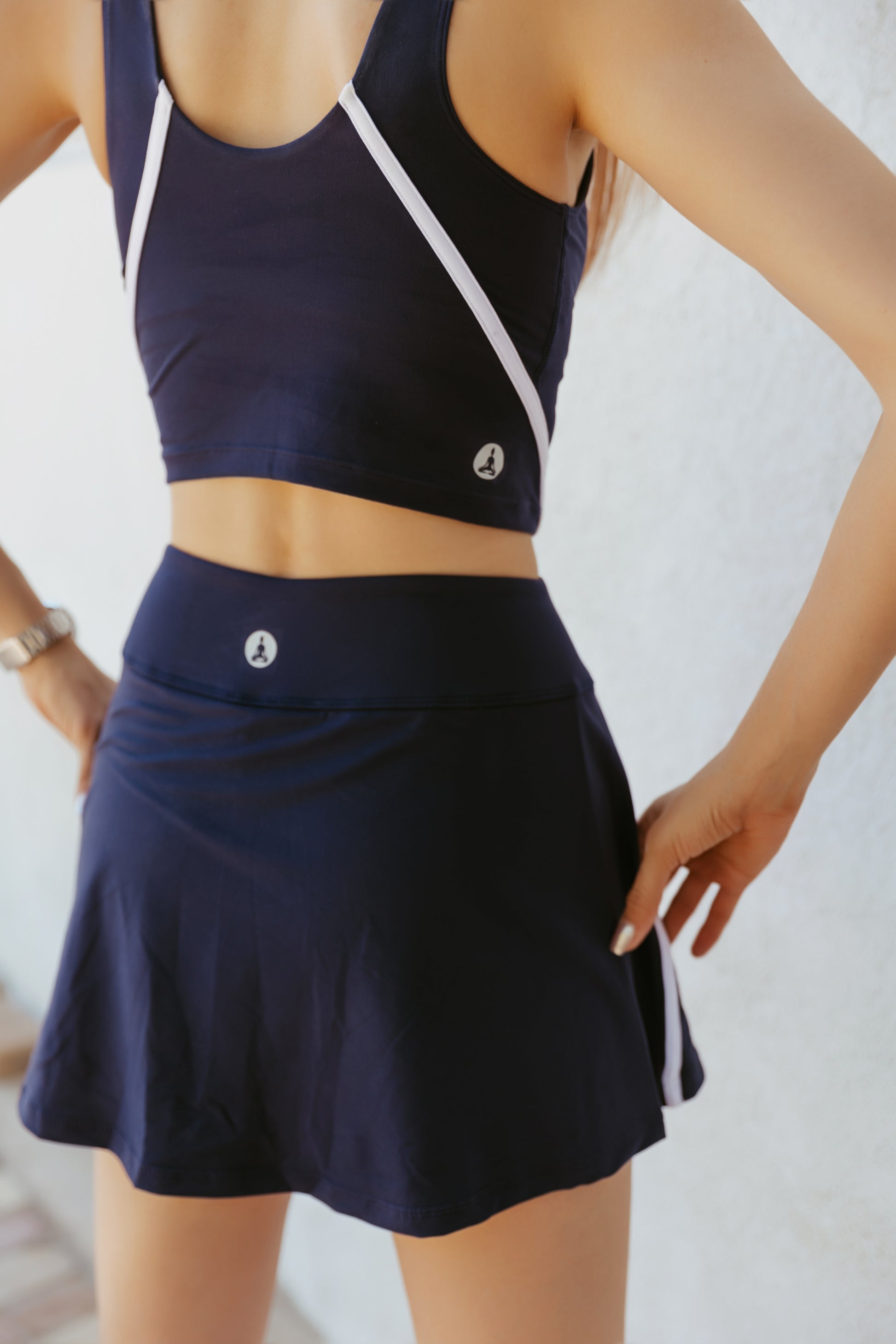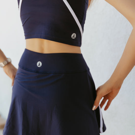 The Warrior Waves Skort blends feminine elegance with athletic performance, a skirt on the outside and supportive shorts underneath for ultimate comfort and coverage. Made from buttery-soft recycled microfiber (84% Recycled Polyester, 16% Spandex), this navy-blue skort features a sleek white side piping detail that adds a chic, modern touch to your studio-to-street style.